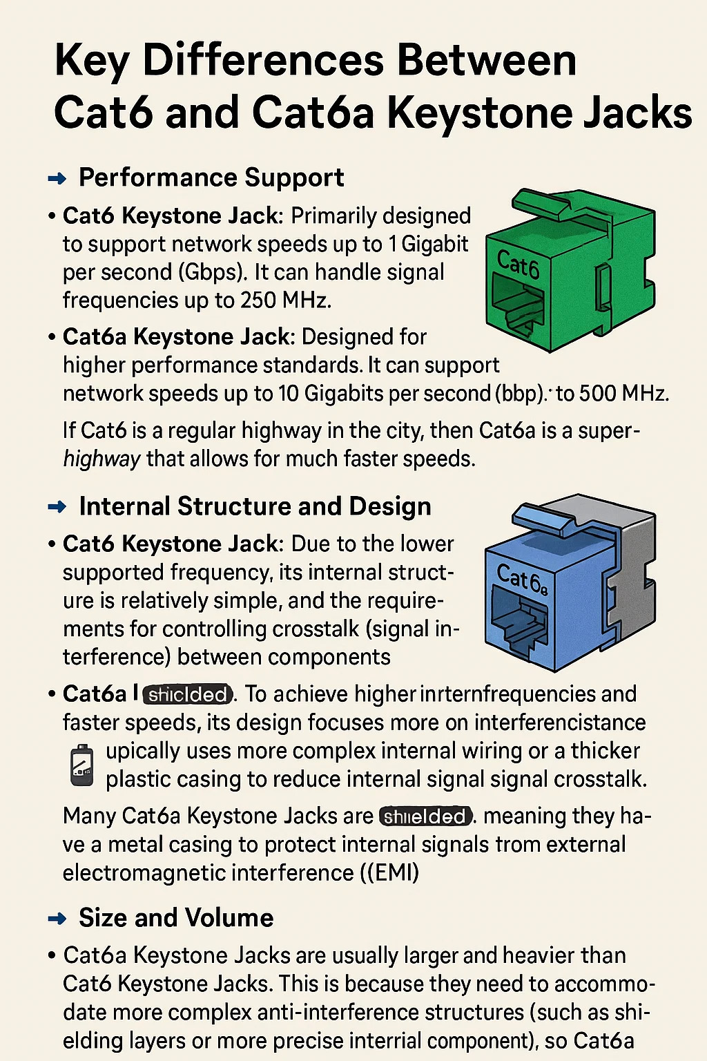 • Giắc cắm Keystone Cat6a thường **lớn hơn và nặng hơn** so với Giắc cắm Keystone Cat6.