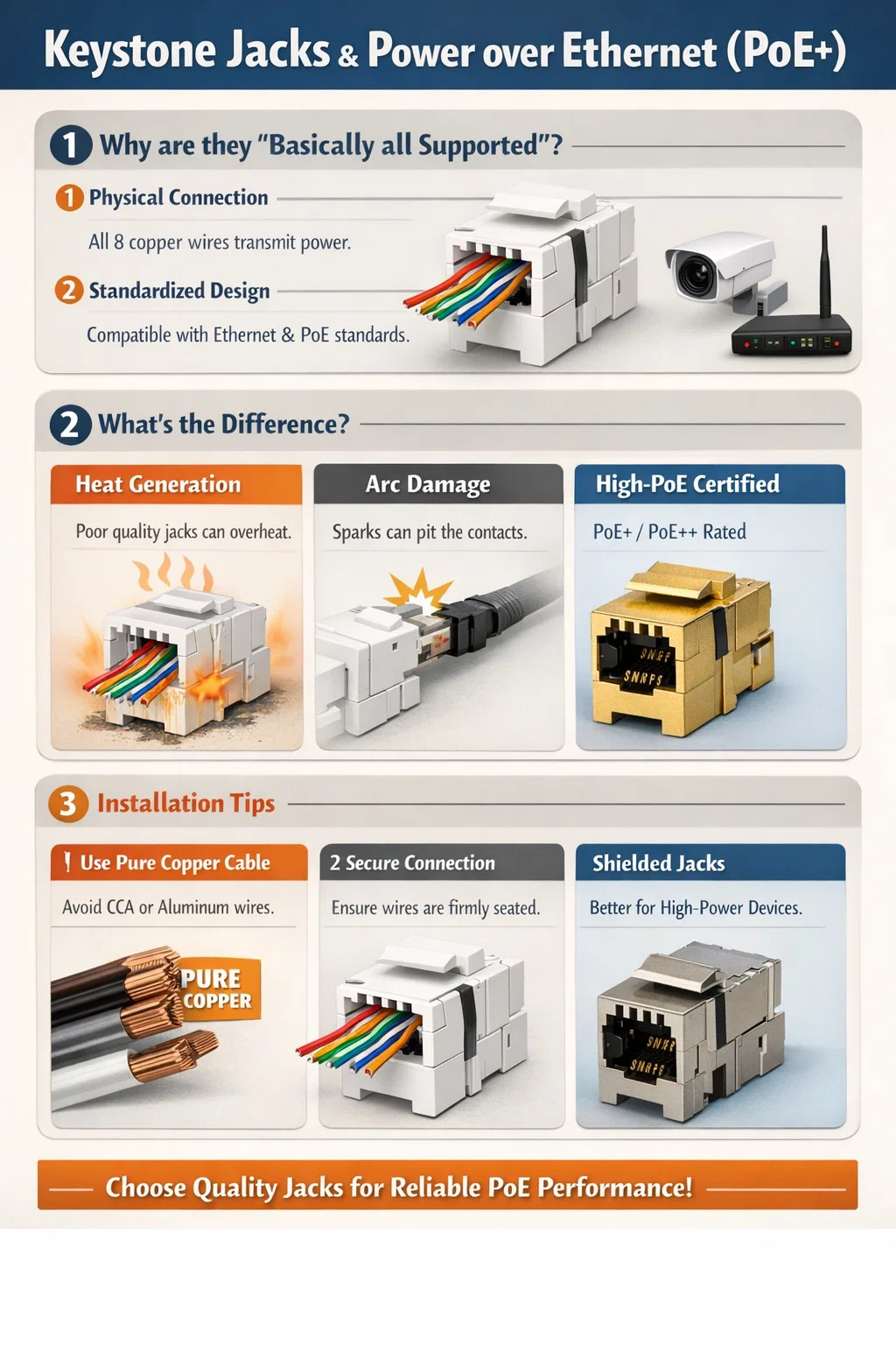 Phần lớn các đầu nối cáp mạng tiêu chuẩn ( Giắc cắm Keystone ) hỗ trợ vật lý Cấp nguồn qua Ethernet (PoE), nhưng không phải tất cả các sản phẩm đều có độ tin cậy như nhau khi hoạt động ở mức tải cao thực tế.