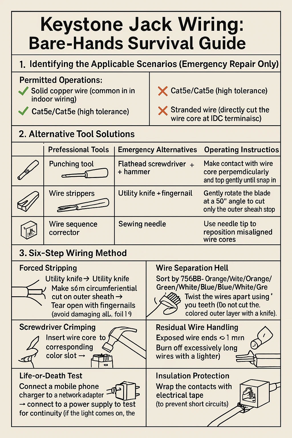 | Dụng cụ tháo dây | Móng tay bằng dao tiện ích | • Lưỡi dao ở góc 30° với cáp· Xoay nhẹ → dừng lại ở lớp che chắn· Lột vỏ bằng đinh | (Cao) |