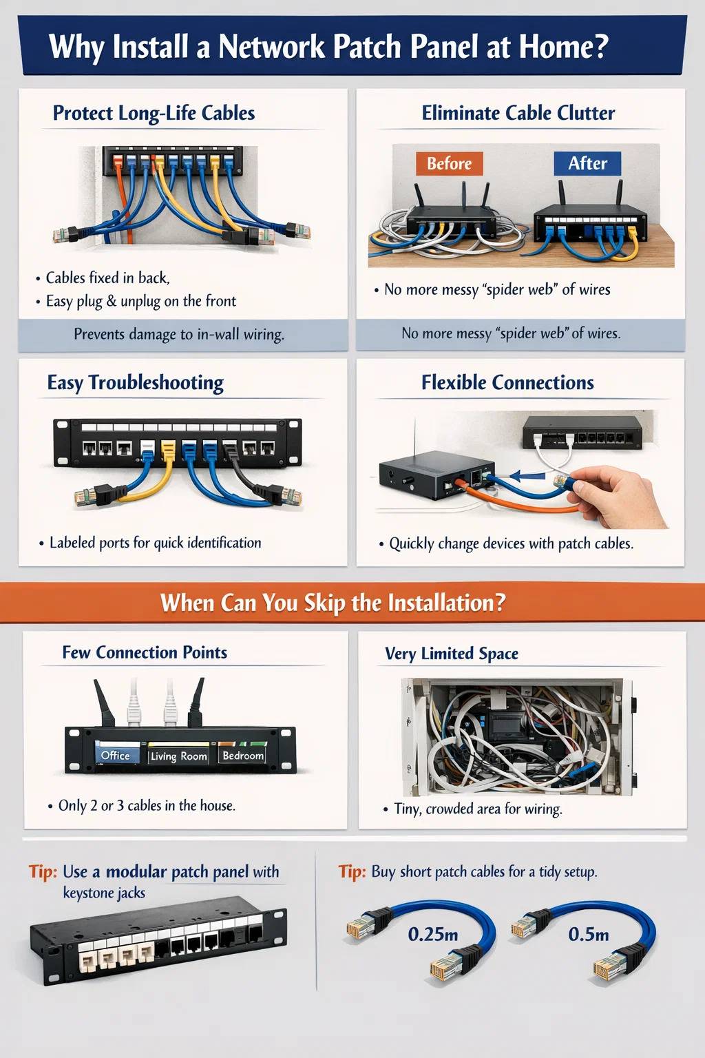 Nếu bạn có dây cáp chạy đến mọi phòng trong nhà thì có thể có từ 5 đến 10 dây cáp mạng trong hộp điện áp thấp. Việc cắm chúng trực tiếp vào bộ định tuyến sẽ khiến dây điện rối tung, khiến cửa tủ không thể đóng được. Với Patch Panel, tất cả các dây cáp được sắp xếp gọn gàng thành một hàng, mỗi cổng đều được đánh số, nhìn rất đẹp mắt.