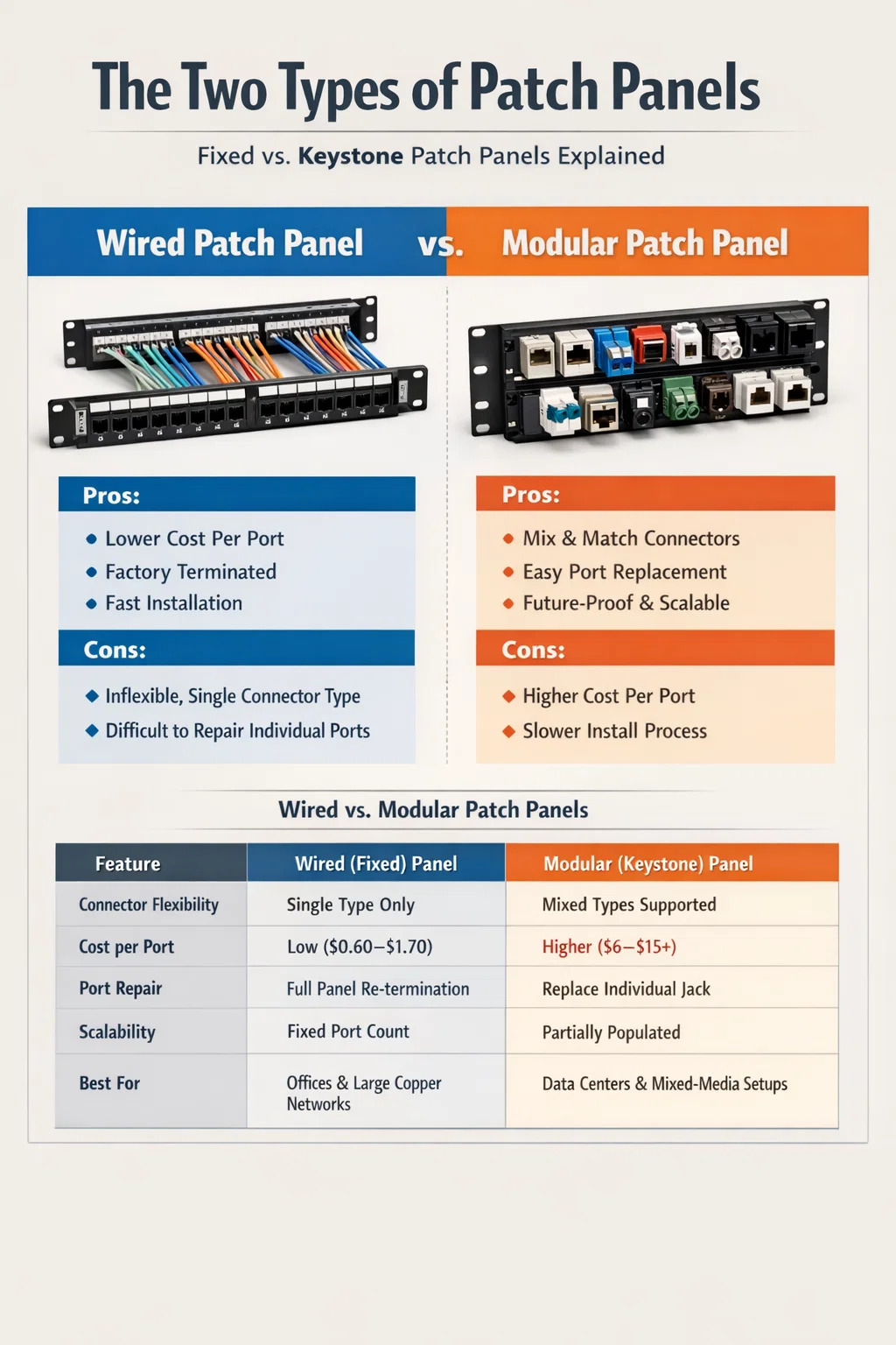 Hai loại bảng vá lỗi chính là bảng vá lỗi có dây (cố định) và bảng vá lỗi mô-đun (keystone) . Hai loại này tạo thành nền tảng của hệ thống cáp có cấu trúc ở hầu hết mọi trung tâm dữ liệu, phòng máy chủ và lắp đặt mạng thương mại. Hiểu sự khác biệt giữa chúng là điều cần thiết trước khi mua bảng vá mạng hoặc thiết kế bố trí cáp, vì lựa chọn sai có thể tạo ra các vấn đề về chi phí, tính thiếu linh hoạt hoặc hiệu suất không cần thiết.