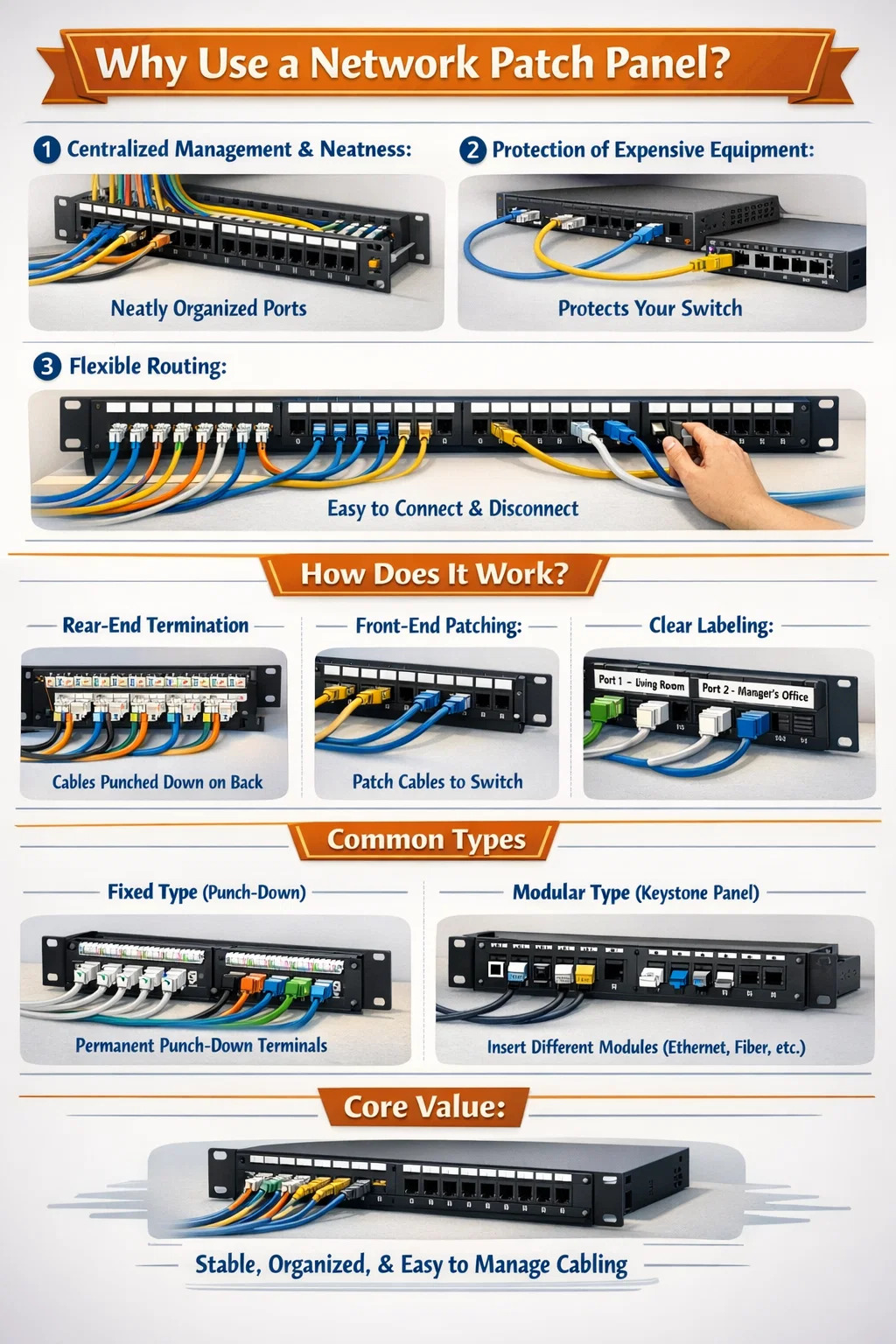 Mục đích của bảng vá lỗi mạng không phải là làm cho mạng nhanh hơn mà là làm cho mạng ổn định hơn, thẩm mỹ hơn và dễ bảo trì hơn. Đó là ranh giới giữa hệ thống cáp chuyên nghiệp và hệ thống cáp lộn xộn.