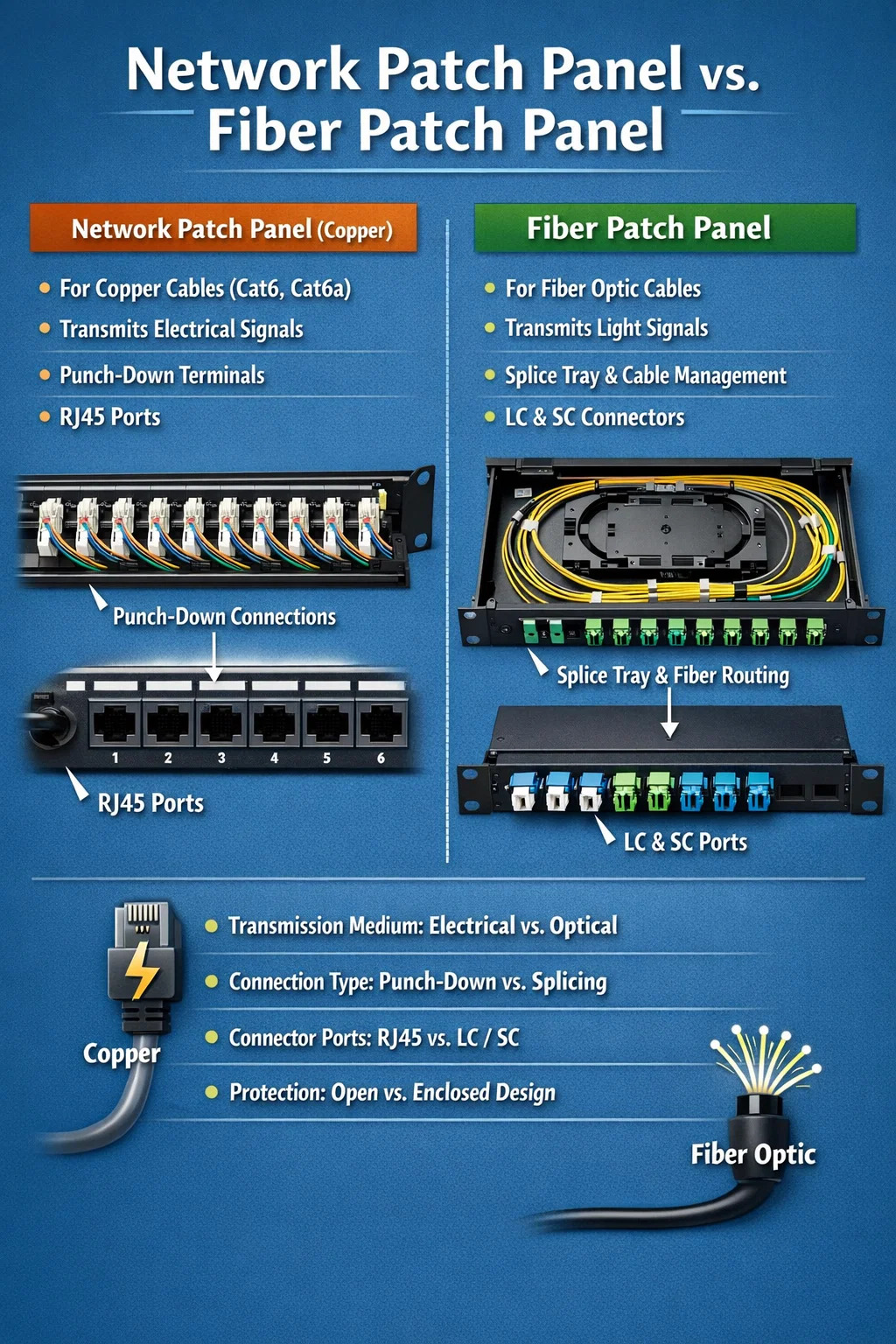 Bảng vá lỗi mạng: Nó được thiết kế cho cáp đồng (tức là cáp mạng Cat6 hoặc Cat6a thường được sử dụng). Nó kết nối dây đồng bên trong, truyền dữ liệu qua các xung điện.