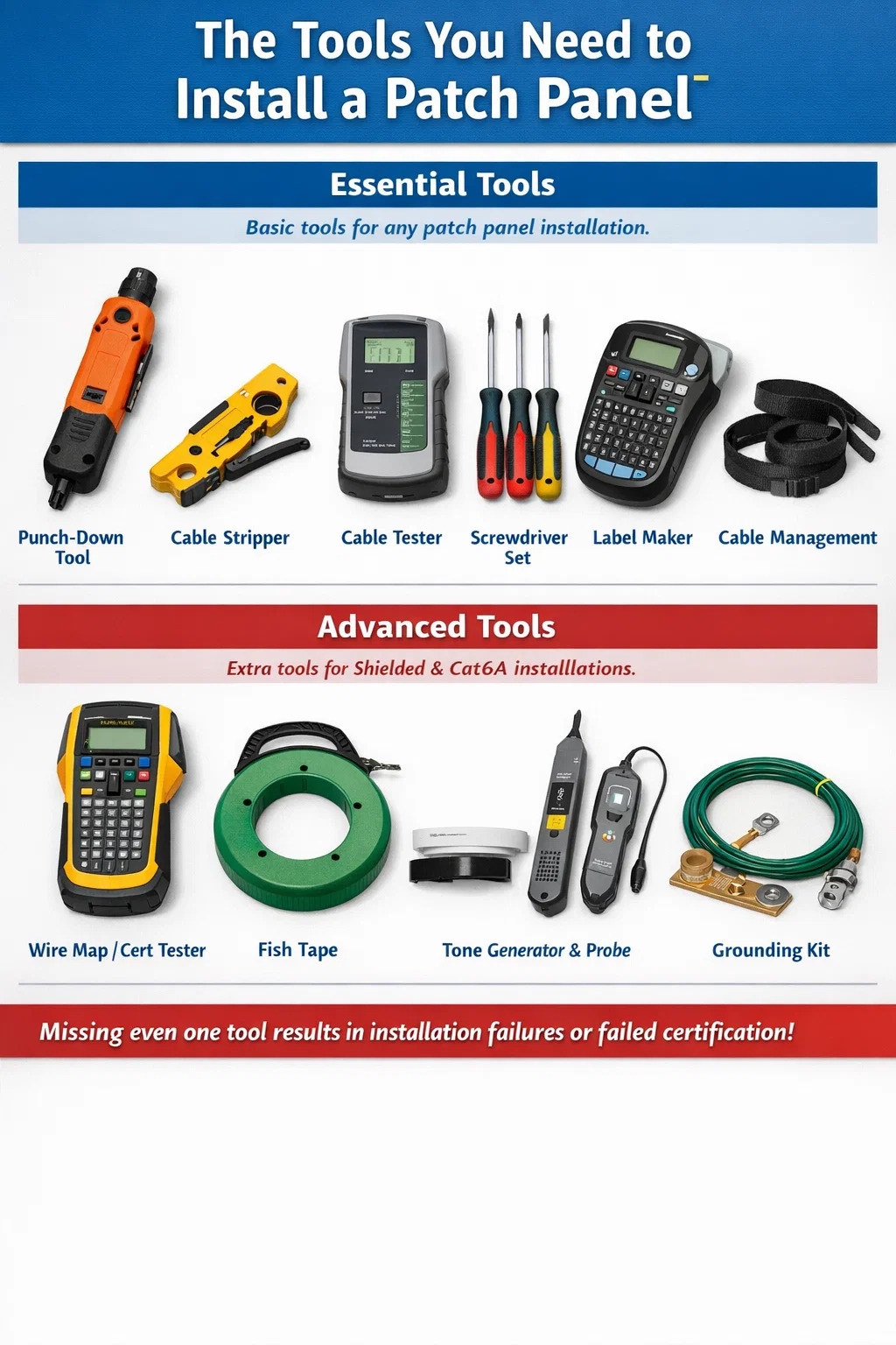 Đối với ai đó lần đầu tiên cài đặt bảng vá lỗi mạng tại nhà hoặc văn phòng nhỏ, một bộ công cụ tối thiểu sẽ bao gồm những thứ cần thiết mà không phải trả chi phí không cần thiết. Đối với một trình cài đặt chuyên nghiệp triển khai các bảng vá lỗi thường xuyên cho các dự án thương mại, một bộ công cụ hoàn chỉnh sẽ mang lại chất lượng và tốc độ mà công việc chuyên nghiệp yêu cầu.