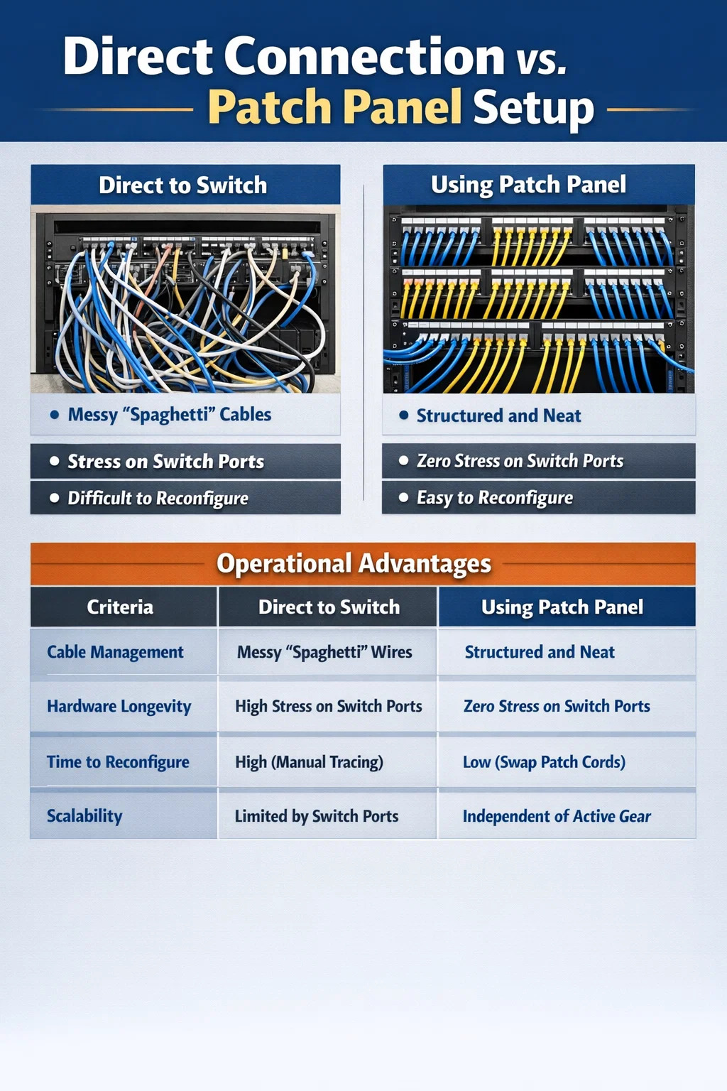 Bạn bận tâm với một bảng vá lỗi mạng bởi vì nó đóng vai trò là cầu nối quan trọng giữa hệ thống dây điện cố định, cứng chắc bên trong các bức tường của bạn và các thiết bị điện tử đang hoạt động trong giá máy chủ của bạn. Nếu không có nó, bạn có nguy cơ bị hư hỏng vật lý đối với dây cáp, mắc phải tình trạng rối dây "spaghetti" khiến không thể khắc phục sự cố và mất khả năng dễ dàng cấu hình lại mạng của mình. Nó biến một bó dây hỗn loạn thành một hệ thống chuyên nghiệp, được gắn nhãn và có thể mở rộng để bảo vệ khoản đầu tư phần cứng của bạn.